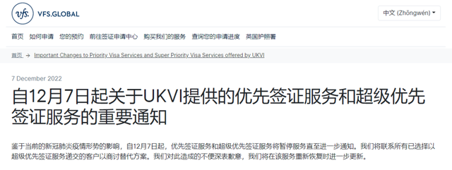 鉴于当前的新冠肺炎疫情形势的影响,自12月7日起,优先签证服务和超级优先签证服务将暂停服务直至进一步通知。