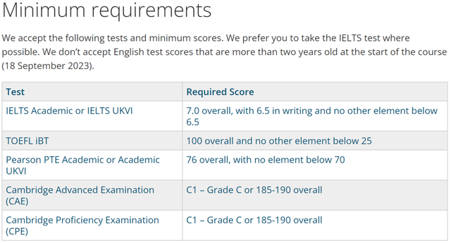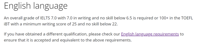 雅思总分7.0,写作7.0,其他不低于6.5;或托福iBT总分100+,写作不低于25,其他不低于22。
