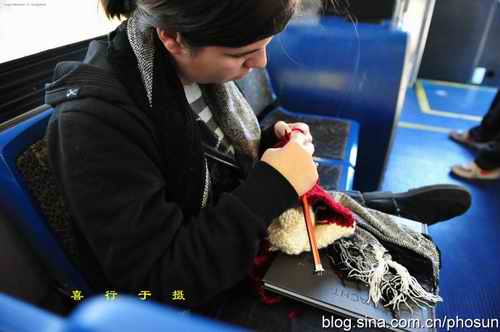 坐在公交车上,迷迷糊糊的懒洋洋的望着窗外的热带风光。车子到了一个新的站点,上来一位年轻的姑娘。打开手袋,拿出来的竟是毛衣,有模有样的织起来了。大本夹子告诉我,可能是个大学生。